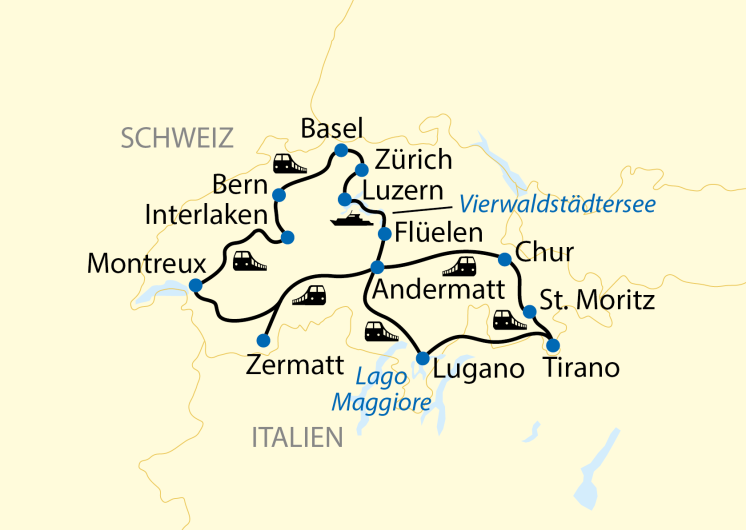 - Regio-Bahnen innerhalb der Reise finden je nach Verfügbarkeit und Zuteilung der SBB in 2.- oder 1. Klasse statt