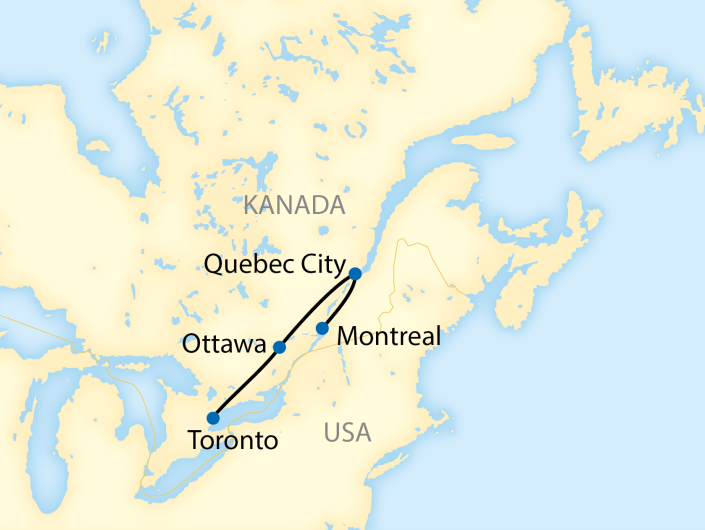 - 8 Übernachtungen in Mittelklasse-Hotels in Montréal, Québec City, Ottawa und Toronto
